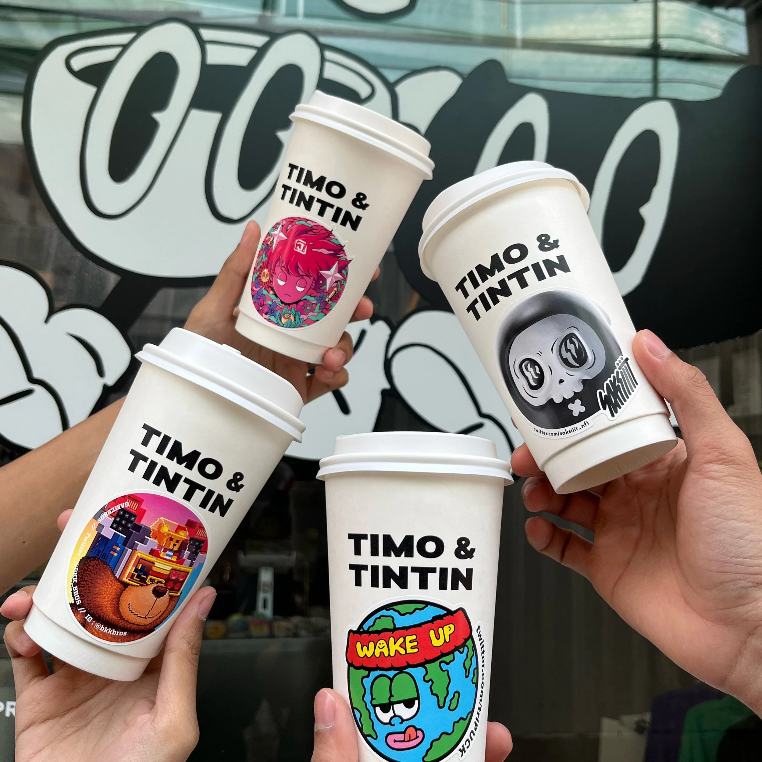 I can say 100% that this was not a normal coffee shop. It was a place that supported creative dreams, from juniors to masters. Over 4 years, we collaborated with many artists and studios, such as Bangkok Design Week, Timo and Tintin x Painterbell x Phannapast, SIP & Spin (Timo and Tintin x Gad House), Timo and Tintin x BKK NFT Artists, and many more…